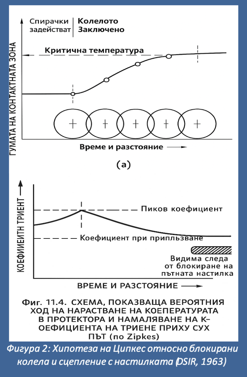 През 1944 г. Е. Зипкес (Zipkes, 1944) изказва хипотезата: „При някои пътни настилки, точката на топене на свързващото вещество… (битумния слой)… може да бъде достигната преди тази на каучука от грайфера на гумата, в който случай коефициентът на приплъзване ще има различна стойност в сравнение със случая, когато първо се стопява каучукът.“
